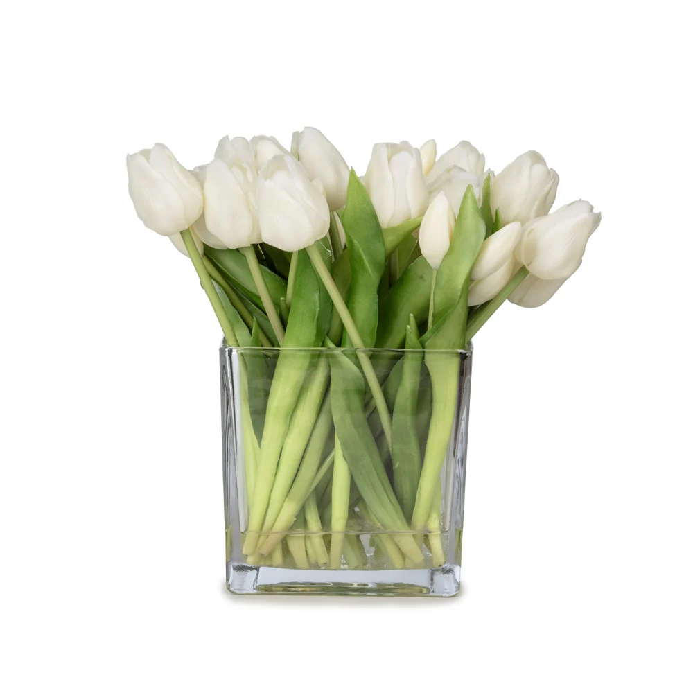 Büyük Kare Cam Vazoda Islak Dokulu Jelli Beyaz Lale Aranjman (27 CM)