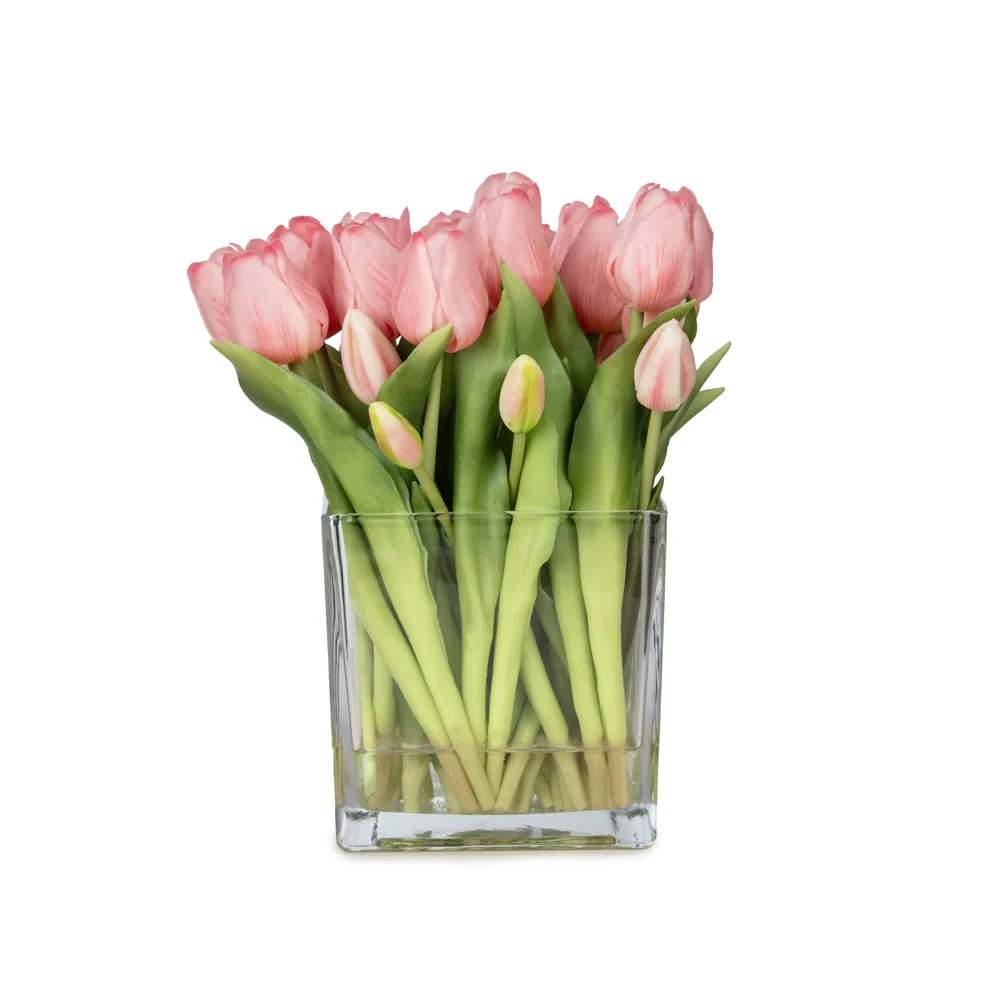Büyük Kare Cam Vazoda Islak Dokulu Jelli Pembe Lale Aranjman (27 CM)