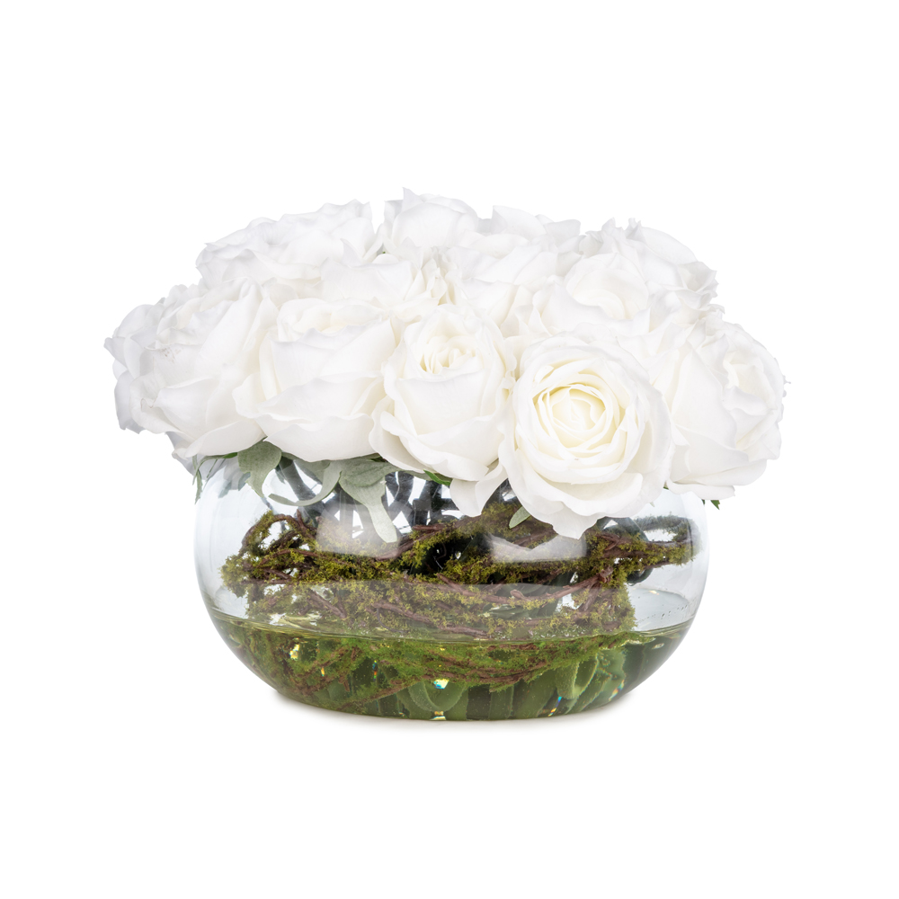KUK Çiçek » Yapay Çiçek Aranjman » Cam Vazolu Aranjmanlar » Jelli Islak Dokulu Açmış Beyaz Gül Aranjman (18 CM)