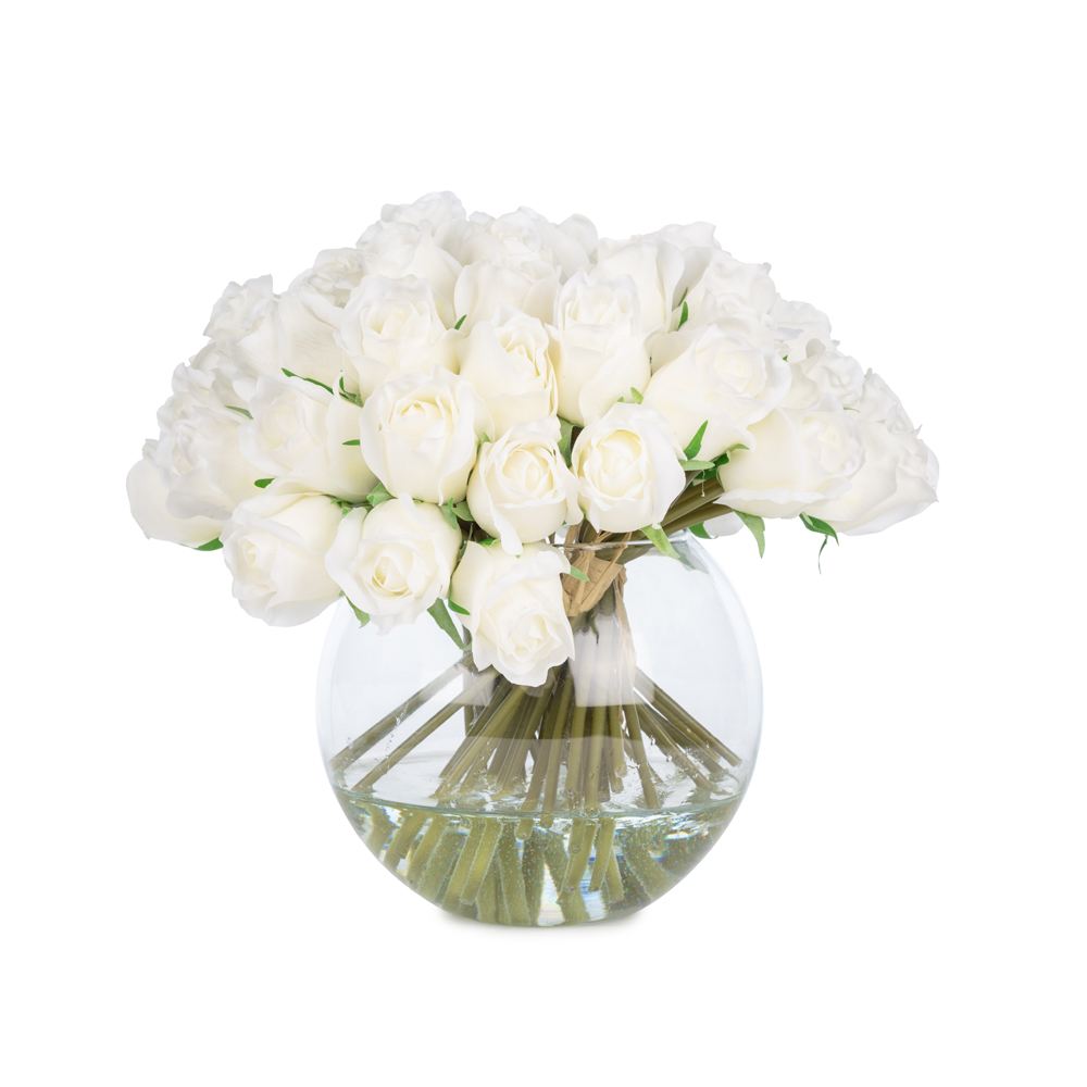 KUK Çiçek » Yapay Çiçek Aranjman » Cam Vazolu Aranjmanlar » Jelli Islak Dokulu Beyaz Gonca Gül Aranjman (26 CM)