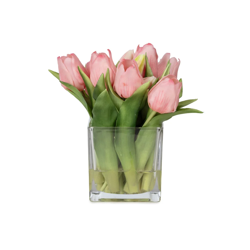 Küçük Boy Kare Cam Vazoda Islak Dokulu Jelli Pembe Lale Aranjman (20 CM)