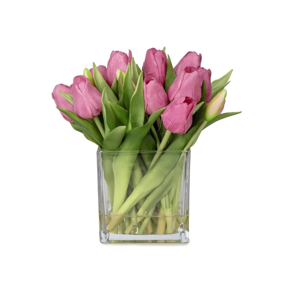 Orta Boy Kare Cam Vazoda Islak Dokulu Jelli Mauve Lale Aranjman (25 CM)