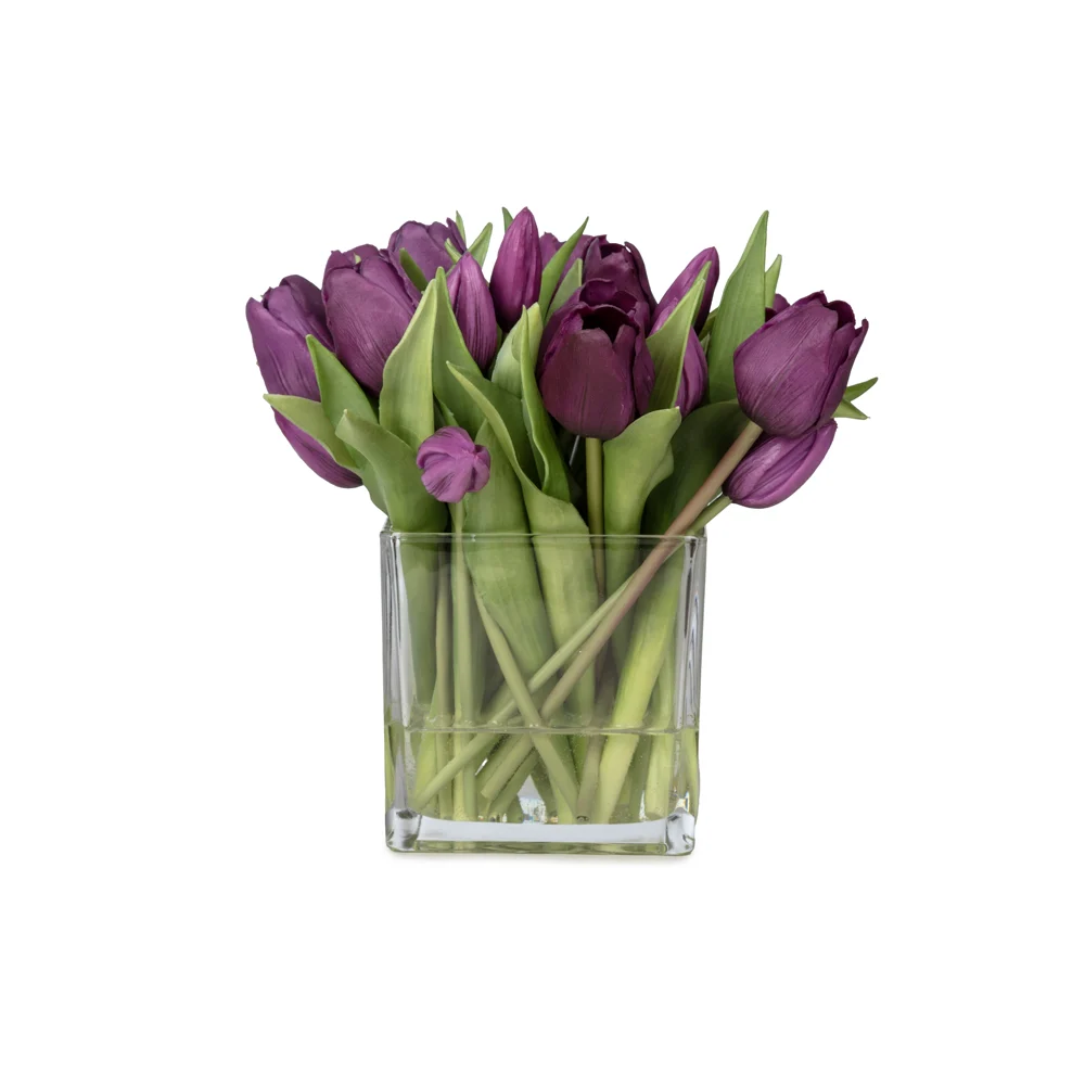 Orta Boy Kare Cam Vazoda Islak Dokulu Jelli Mor Lale Aranjman (25 CM)