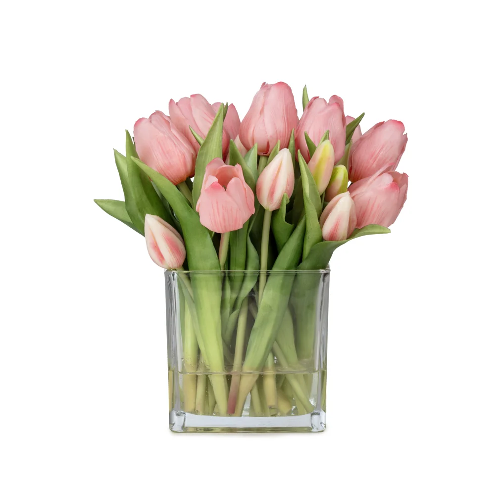 Orta Boy Kare Cam Vazoda Islak Dokulu Jelli Pembe Lale Aranjman (25 CM)