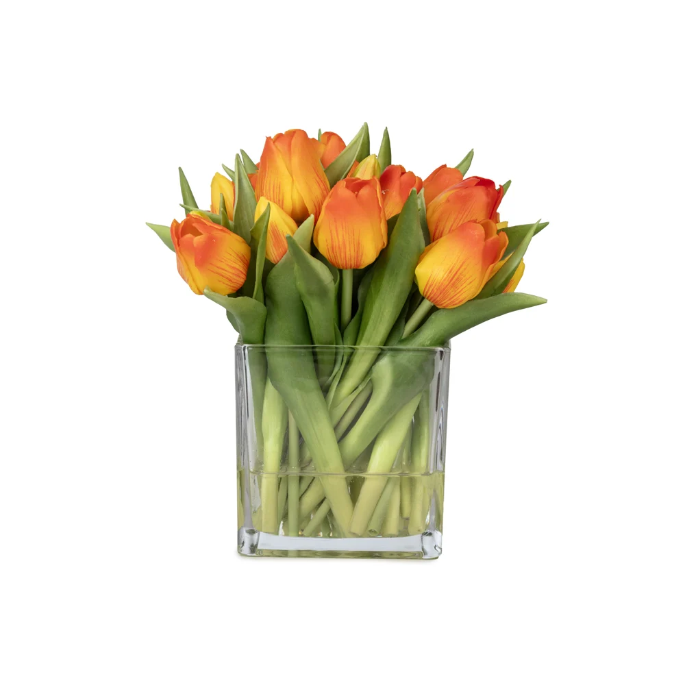 Orta Boy Kare Cam Vazoda Islak Dokulu Jelli Turuncu Lale Aranjman (25 CM)